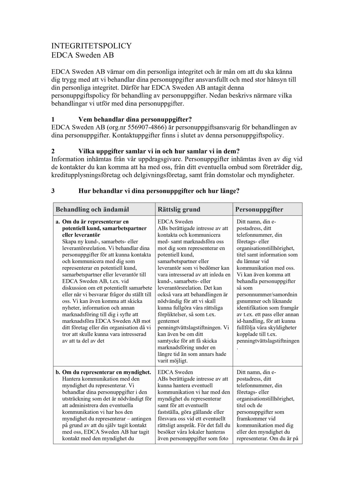 EDCA Sweden AB värnar om din personliga integritet och är mån om att du ska känna dig trygg med att vi behandlar dina personuppgifter ansvarsfullt och med stor hänsyn till din personliga integritet. Därför har EDCA Sweden AB antagit denna personuppgiftspolicy för behandling av personuppgifter. Nedan beskrivs närmare vilka behandlingar vi utför med dina personuppgifter.